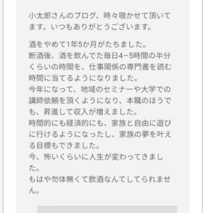 酒辞めたら、実質的に豊かになって、精神的にも豊かになって、幸せを感じやすくなってくるんですから。
